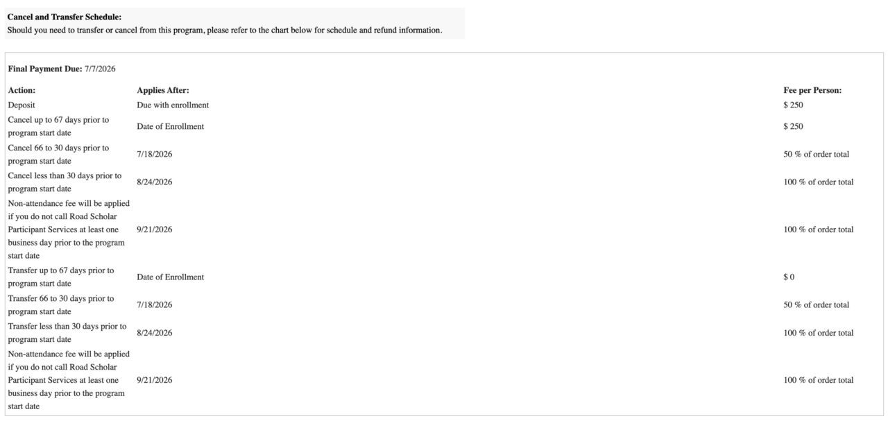 At the time of enrollment, there will be a $250 per person deposit and final payment will be due on 7/7/2026.